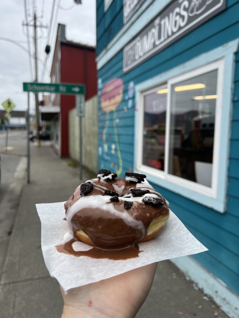 The bus let us off at the far end of the cruise terminals near town. We have a bit of time before we need to meet up for our excursion so we are planning on stopping at Jellyfish Donuts and heading to Creek Street. Even though we were among the first from our ship to get into town, other ships were also letting people off. The line at Jellyfish Donuts was already substantial. Ben and I split a fresh cookies and creme donut and it was one of the best donuts we’ve had.